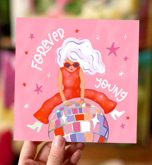 Kaart verjaardag felicitatie vrouw met discobal forever young grappig roze