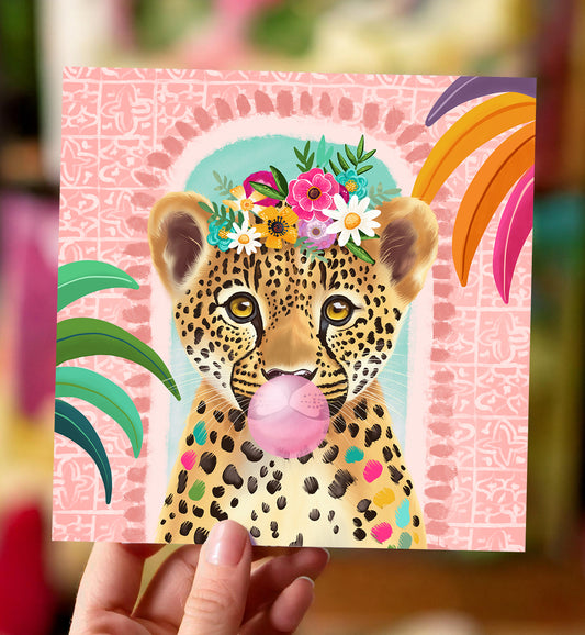 UitverkochtKaart luipaard en bloemen verjaardag zomaar roze