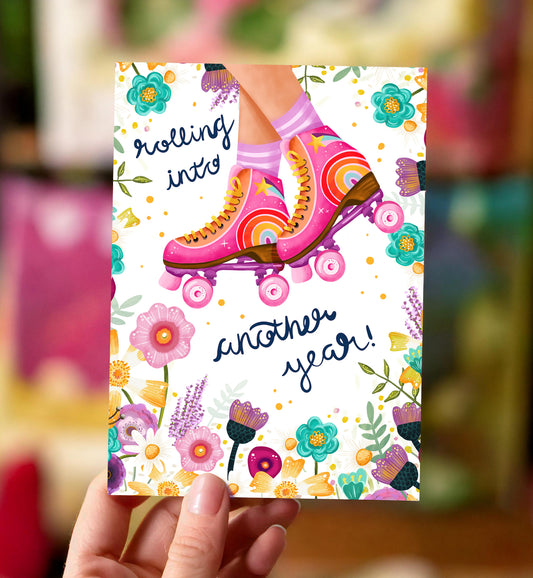 Kaart verjaardag rolschaatsen felicitatie bloemen roze