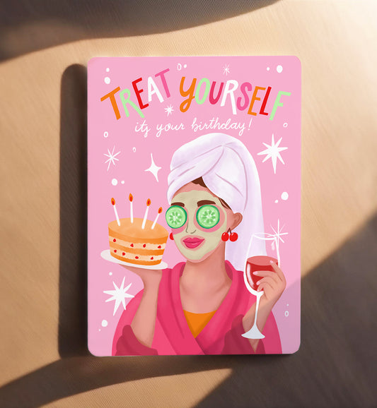 Kaart verjaardag vrouw taart wijn verwen jezelf relax ansichtkaart