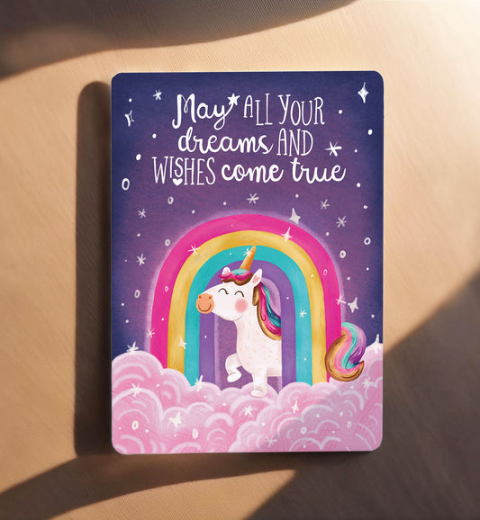 Kaart zomaar kind eenhoorn met regenboog wensen dromen verjaardag ansichtkaart