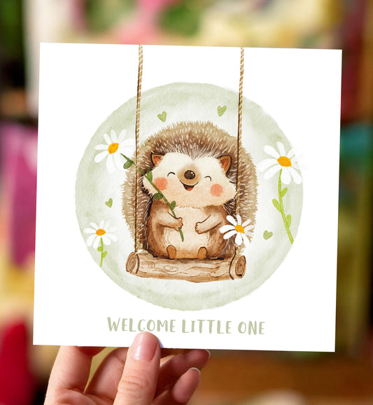 Kaart felicitatie geboorte egel op schommel met bloemen baby