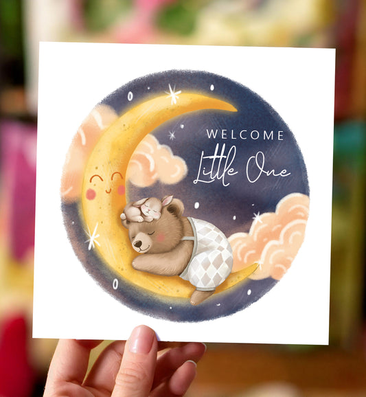 Kaart felicitatie geboorte beer en konijn op maan en sterren schattig baby ansichtkaart