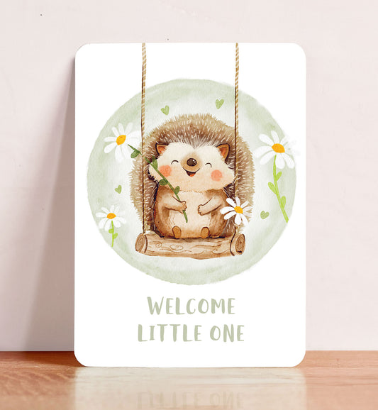 Kaart felicitatie geboorte baby egel op schommel met bloemen ansichtkaart
