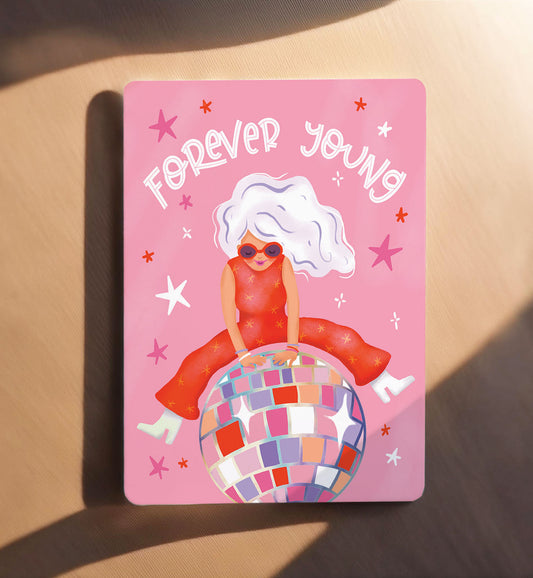 Kaart verjaardag felicitatie vrouw met discobal forever young grappig roze ansichtkaart